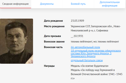 Награды: Медаль «За победу над Германией в Великой Отечественной войне 1941–1945 гг.», Медаль «За взятие Будапешта»