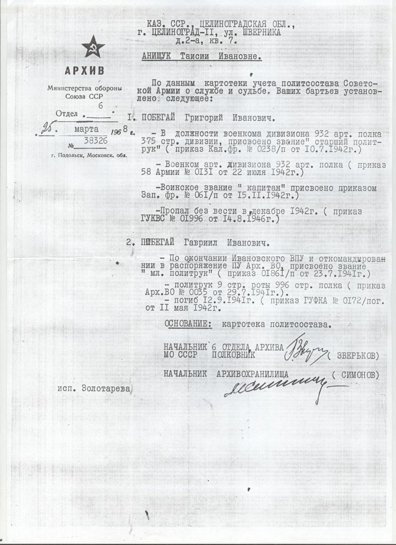 12 сентября 1941 года Побегай Гавриил Иванович погиб в бою (приказ ГУФКА № 0172/пог. от 11 мая 1041 г.) и похоронен в 1 км от северо-восточнее д. Вороново, Ленинградской области.