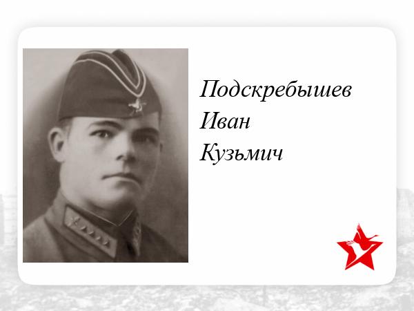 Брат моего дедушки по материнской линии, Подскребышев Иван Кузьмич (1912 г.р.), уроженец деревни Кулешовка, станция Токаревка, Полетаевского района Тамбовской области, был призван в ряды РККА 26 августа 1941 года Истринским РВК Московской области. Известно, что он относился к младшему командному составу и имел военно-учётную специальность воздушный стрелок-радист. Вероятно, Иван Кузьмич служил в ВВС РККА ещё до войны, о чём свидетельствует его фотография в форме старшины авиации. Согласно архивным документам, он состоял в армии с 1934 года и окончил школу связи.