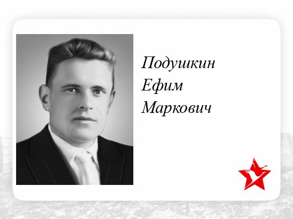 Подушкин Ефим Маркович родился 14 января 1908 года в крестьянской семье в селе Панино Медвенского р-на Курской области. Его родители занимались хлебопашеством в своем хозяйстве. В период прихода белых банд Деникина, в Панино было сожжено около ста домов, в том числе и постройка родителей Ефима. С 1919 года семья Подушкиных жили в землянке и в хозяйстве имели одну лошадь. Среди родственников Подушкина Е.М. кулацких хозяйств не было, так что оказать какую либо существенную помощь было некому. Отец пас общественный скот. Ефим с детства трудился на ровне с отцом. До революции работал по найму у кулака батраком. С 1919 по 1923 год пас общественный скот в селе 2-е Панино. С 1923 по 1929 год работал чернорабочим в Петринском свеклосовхозе. Мать Ефима умерла в 1919 , а отец скончался в 1931-м году.