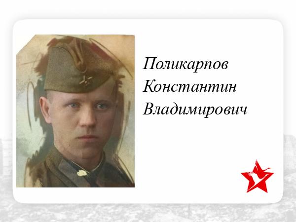 Константин родился в 1914 году в большой дружной семье Поликарповых. У него было три брата и сестра. Костя был младшим в семье. Проживали в городе Ленинграде по адресу: Конная ул., д.11/4, кв. 24. Был призван (или пошел добровольцем) Смольнинским РВК г. Ленинграда 24.06.1941 года. Службу начинал в отдельном разведывательном батальоне (№ 4298 ?). Погиб 23.07.1941 года в пос. Утрогошь, Шимского р-она, Новгородской области. Семья получила похоронку 11 августа 1941 года. Два старших брата Николай и Иван тоже погибли (пропали без вести). Сестра Зинаида выжила во время блокады и сохранила для нас потомков документы.