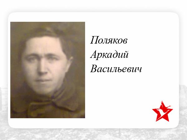 Поляков Аркадий Васильевич был отцом 4 сыновей Виталия,Вячеслава,Владимира и Валерия. До 1939 года работал учителем в школе с.Покровское Черемисиновского района Курской области.С 1939 года работал завучем педагогического училища г.Щигры Курской области. В 1940 году он был призван в армию и в 1941 году погиб в боях под Ленинградом и считался без вести пропавшим.Место захоронения по сей день не известно.