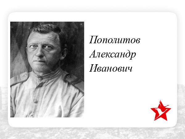 Мой дедушка, Пополитов Александр Иванович,старшина роты 114 отделения саперного батальона 10 Днепровского танкового корпуса был участником форсирования Днепра в местечке Монастырское в 1943г. Участвовал в сражении на Курской дуге. В июле 1944г. был командиром отделения 77-ого отдельного мотоциклетного батальона разведчиков при 10 танковом корпусе. Участвовал в освобождении г.Рига от немецко-фашистких захватчиков. Был ранен. Во время угрозы окружения, по приказу командования, закопал все свои боевые награды в неизвестном месте. Вернулся с войны живой. Вырастил четырех дочерей и воспитал семерых внуков и внучек. Умер 18 октября 1981г.