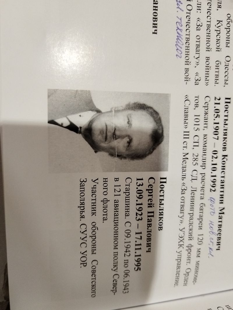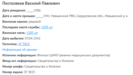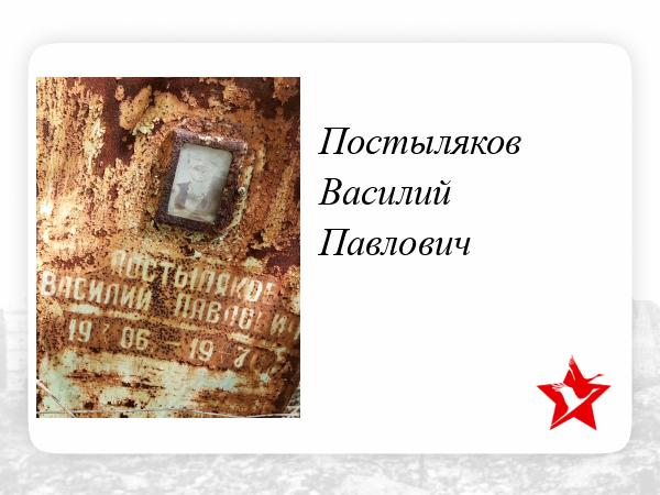 Постыляков Василий Павлович,1906-1970гг родился в п.Верх-Нейвинске.Призван в 1941 г Невьянским РВК.Служил в 1205 сп.Ранен ,выписан из ЭГ 3825 07.04.1942 г. В книгу Памяти не занесен. Похоронен из г.Свердловск-44 с ул Театральный проезд,6-.. Контора Ремстрой.