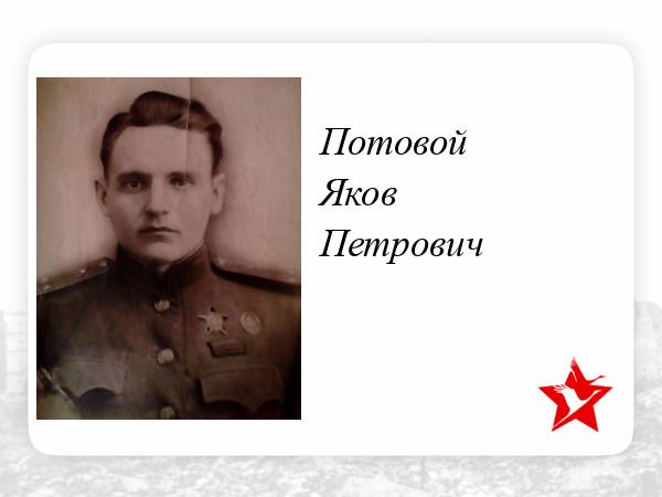 Участник Отечественной войны с 23.11.1941 по 10.12.1941 в боях за оборону Москвы и социалистической Родины в составе 1-ой гвардейской …ской мотострелковой дивизии 6-го гвардейского мотострелкового полка в должности командира взвода ПА под Нарофоминском т. Потовой командуя взводом 20.11.1941 разбил 2 дзота и уничтожил до ……. атакующей пехоты противника, чем обеспечил продвижение своей пехоты и взятие ж.д. вокзала?, что т.о. ………. , за что лейтенант Потовой Я.П. был представлен к правительственной награде 10.12.1941 своим взводом разбил штаб пехотного полка противника, чем обеспечил продвижение своей пехоты. В боях за Родину лейтенант Потовой был дважды ранен, одно из них - тяжелое. В декабре 1943 года работая командиром батареи 24 ЗАП, готовя резервы для фронта по оценке инструктирующих во главе с генерал-лейтенантом артиллерии Гавриленко – кадры подготовлены хорошо. Неоднократные отзывы с фронта, при отправке маршевых батарей – личный состав подготовлен хорошо, политически устойчив