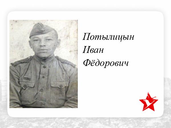 В ночь с 5 на 6 декабря 1944 года при выполнении задания по захвату контрольного пленного, где дед был старшим партии, смело вывел группу к немецким траншеям. Не смотря на то, что группа была обнаружена противником, стремительным броском во главе группы ворвался в траншею и из пистолета убил немецкого солдата, пытавшего оказать сопротивление. Второго солдата обезвредила группа и доставила в командный пункт. В результате чего были получены сведения о вооружении противника в этом районе. 9 декабря 1944 года приказом 43 стрелковой Тартунской краснознамённой дивизии 2 Прибалтийского фронта сержант Потылицын И.Ф. был награждён орденом Красной Звезды.