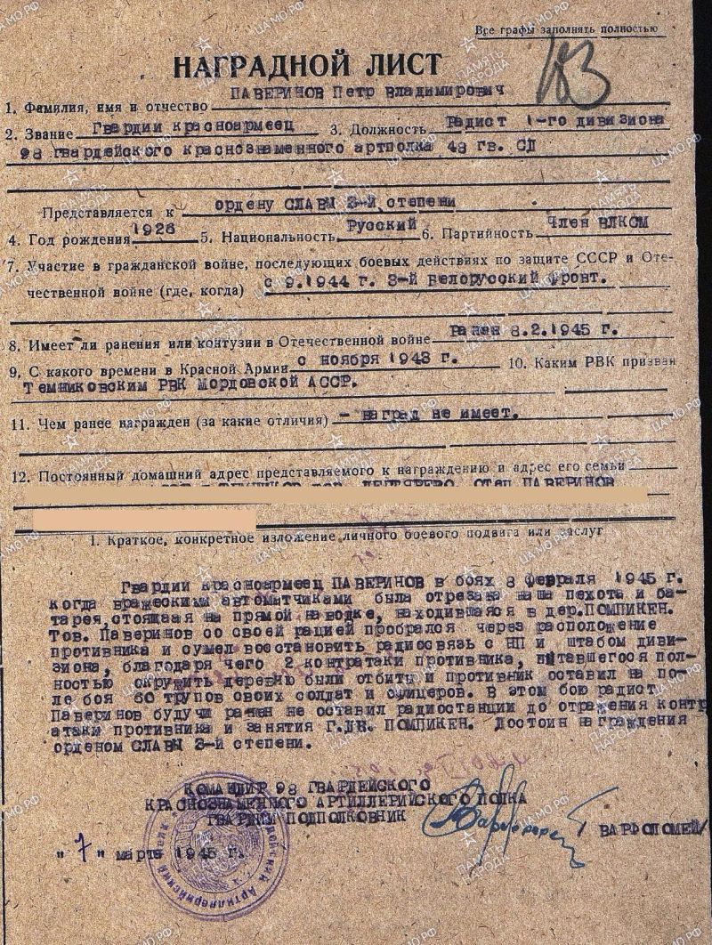 Поверинов Петр Владимирович - это мой любимый дедуля. О войне нам он рассказывал совсем чуть-чуть. Только то, что он был ранен, долгое время был в госпитале в Кениксберге (Калининград), домой вернулся только в 1946 году. В госпитале ампутировали ногу, остался без ноги в 19 лет. Если бы не военврач, мог бы не выжить. Только после его смерти мой муж распечатал мне один документ, в котором написано, что гвардии красноармеец Поверинов П.В. в боях 8 февраля 1945 года, когда вражесткими автоматчиками была отрезана наша пехота и батарея, стоящая на прямой наводке, находившаяся в дер. Помпикен (Восточная Германия). Тов. Поверинов со своей рацией пробрался через расположение противника и сумел восстановить радиосвязь с КП и штабом дивизиона, благодаря чего 2 контратаки противника, пытавшегося полностью окружить деревню были отбиты и противник оставил в этом бою более 60 убитыми своих солдатов и офицеров. В этом бою мой дедушка будучи раненым не оставил радиостанции до отражения контратаки противника и занятия дер. Помпикен. Нарадили его орденом славы 3-й степени, только награда дошла до него аж через 60 лет. К сожалению, моего дедушки не стало в 2014 году, но моя дочь, моя внучка (его праправнучка) всегда будут знать и помнить кем был их дед и прадед, будут всегда гордиться! Пока мы живы, мы будем передавать своим поколениям память о наших дедах и бабушках!