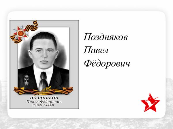 Поздняков Павел Федорович. Участвовал в боях под городами: Рогачев, Харьков, Сталинград. В 1941 году получил ранение в правую ногу, в 1942 – в левую. В 1943 году Под г. Красный Смоленской области был тяжело ранен в правую руку при уничтожении вражеских танков. Всего удалось ликвидировать три танка и один обоз противника. После боя руку пришлось ампутировать. За активное участие в боях по защите Родины, за уничтожение военной техники противника рядовой Поздняков Павел Федорович удостоин Правительственной награды – Медаль «ЗА БОЕВЫЕ ЗАСЛУГИ», а также награжден Орденом Славы III степени.