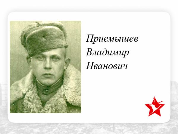 Мой отец - Приемышев Владимир Иванович - родился 16 июля 1922 года в Ленинграде. Детство и школа как у всех сверстников. После школы поступил в мореходное училище.В июне 1941 года ушел на фронт. (Подробней о войне в ВОСПОМИНАНИЯХ). Демобилизован из рядов РККА в ноябре 1945 года по ранению. В 1945 г направлен на учебу в военно-политическое училище им.Энгельса. Из училища ушел и подал документы в институт водного транспорта, который находился в эвакуации. Переезда института в город не дождался и поступил на 3-й курс сварочного техникума, который успешно закончил. Направлен на работу в НИИ. Через несколько месяцев перешел работать на завод Подъемно-транспортного оборудования им. С.М.Кирова. Работал контролером ОТК, старшим контрольным мастером, начальником БТК цеха, зам. начальника ОТК завода, начальником ОТК завода, зам. начальника производства завода. После ухода на пенсию в 1982 году работал контрольным мастером в кузнечном цехе. В 1992 году ушел с завода окончательно.