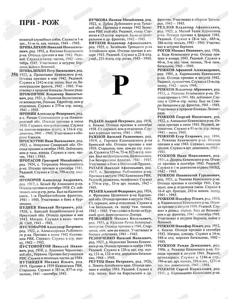 Привалихин Петр Васильевич, 1923 г. р. Место рождения Красноярский край, Кежемский район, д. Прокопьево. Призван Кежемским РВК в 1942 году. Красноармеец. Повозочный. В/ч 497 окшр 5 Уд. А. Участник штурма Берлина. Награждён медалью За боевые заслуги (8.06.1945).