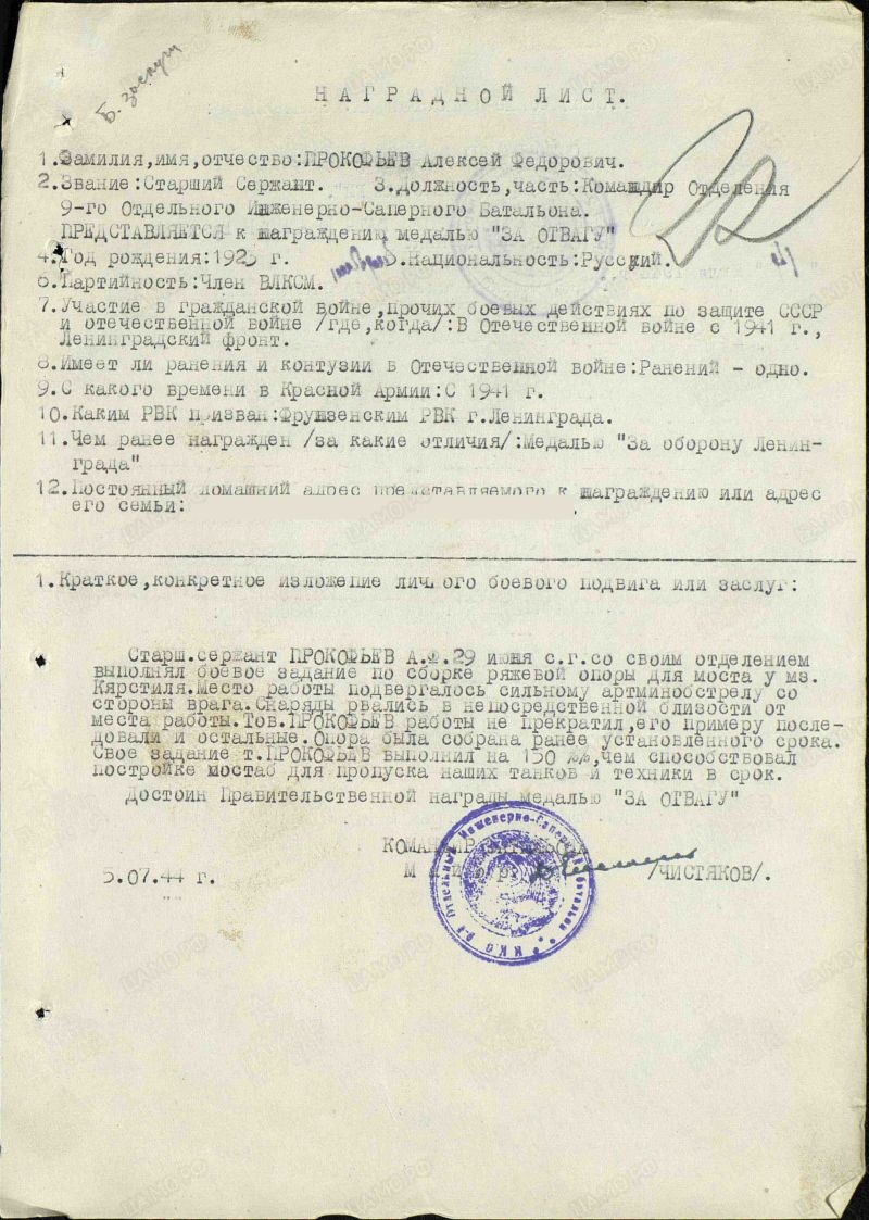29 июня 1944 года со своим отделением выполнял боевое задание по сборке ряжевой опоры для моста у мз. Кярстиля. Место работы подверглось сильному артминобстрелу со стороны врага. Снаряды рвались в непосредственной близости от места работы. Товарищ Прокофьев работы не прекратил, его примеру последовали и остальные. Опора была собрана ранее установленного срока. Свое задание тов. Прокофьев выполнил на 150 %%, чем способствовал постройке моста для пропуска наших танков и техники в срок. Достоин правительственной награды "Медаль за отвагу".