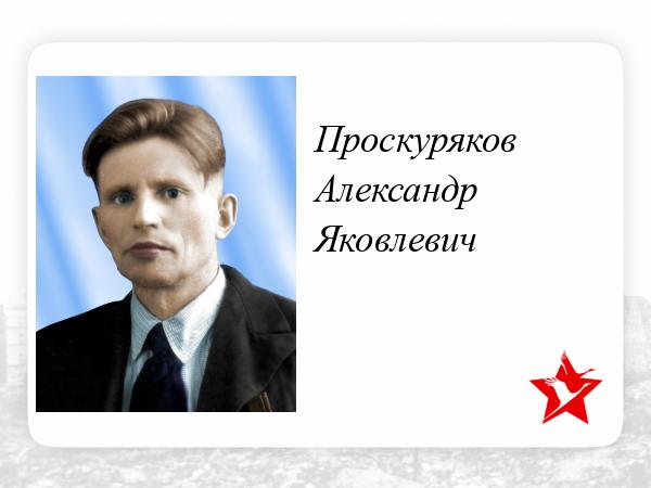 Проскуряков Александр Яковлевич прошел всю войну от начала до самого окончания батальонным разведчиком танкового батальона.В 1941году был взят в плен, сумел бежать и вернулся в ряды Красной Армии для защиты своей Родины. Неоднократно был ранен. Имеет две медали За Отвагу, медаль За Боевые Заслуги, медаль Отечественной Войны II Степени, орден Красной Звезды.