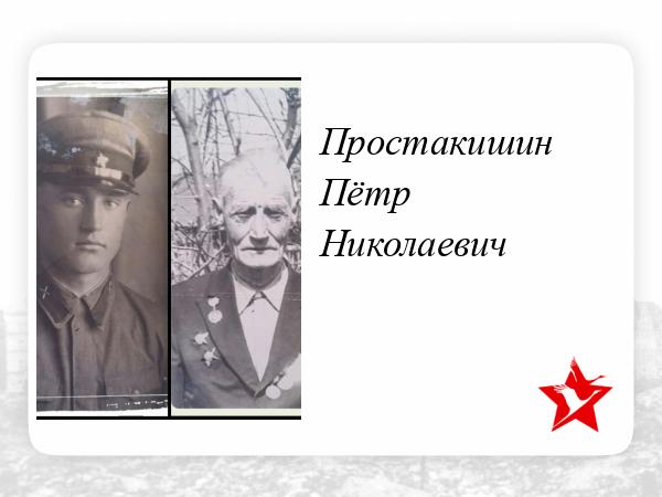 Простакишин Пётр Николаевич 21.12.1917г. В действующую армию призван до начала войны, отслужил четыре года, когда оставался один год до демобилизации началась война. Из Благовещенска их полк перебросили под Тихвин, где уже шли бои. Дальше была оборона Москвы,Курская дуга Где он получил первое ранение и Орден Красной звезды.