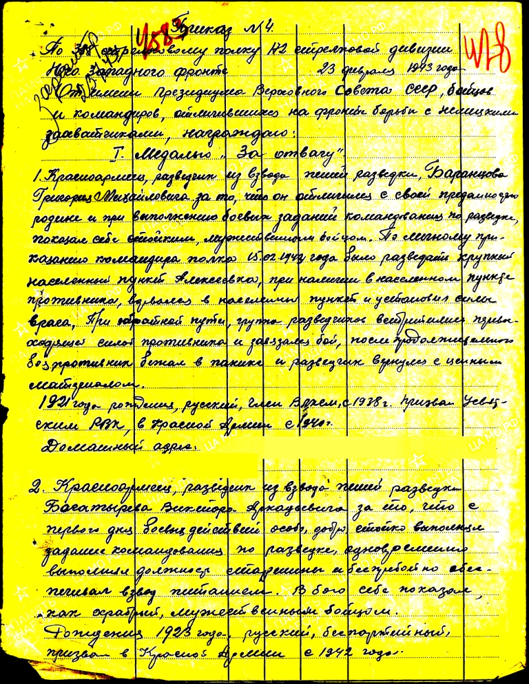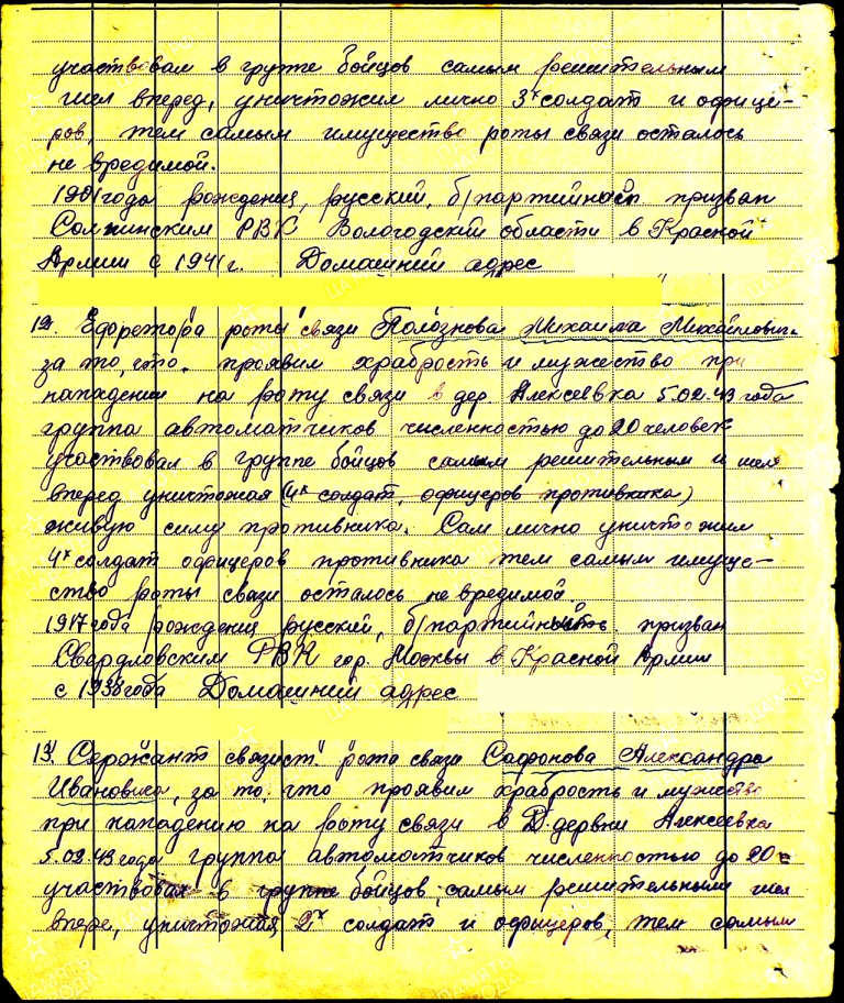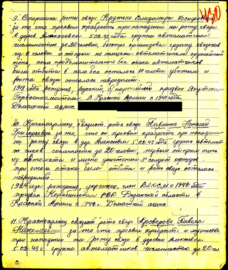 Проворов Павел Николаевич , 1901 г.р., уроженец д. Семенково Сямженского р-на Вологодской обл. Призван Сямженским РВК Вологодской обл. в 1941 году . В Отечественной войне участвовал связистом роты связи 388 стрелкового полка 172 стр. дивизии в составе Юго-Западного фронта . 5.02.1943 года при нападении группой немецких автоматчиков численностью до 20 человек на роту связи в дер. Алексеевка Проворов проявил храбрость и мужество , уничтожил лично 3-х немецких солдат , шел уверенно вперед , тем самым имущество роты осталось невредимым . Награжден медалью «За отвагу» . 04.03.1943 года красноармеец Проворов попал в окружение в районе Шлеховая Харьковской обл. и был пленен . Освобожден из плена нашими войсками 6-й Армии 10.04.1944 года и призван Кагановичским РВК 12.04.1944 года . Проворов воевал в составе 3-го Украинского фронта до окончания войны . После Победы 9 Мая 1945 года награжден медалью «За победу над Германией…»