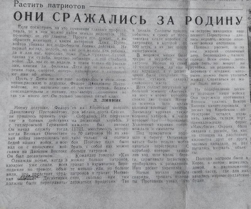 Пустовойтов Фёдор Данилович воевал с японскими войсками на Дальнем Востоке, в составе морской пехоты Тихоокеанского флота (77батальон, бригада морской пехоты, командир отряда).