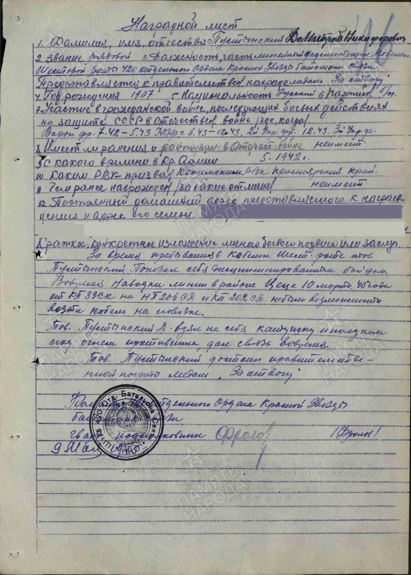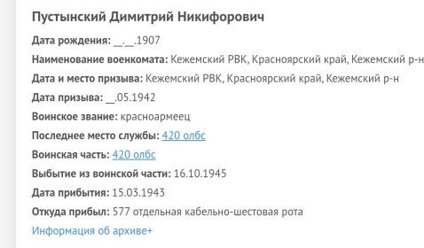 Пустынский Дмитрий Никифорович, 1907 г. р. Место рождения Иркутская область, Шиткинский район, д. Червянка. До войны жил в Красноярском крае, Кежемский район. Призван Кежемским РВК в 1942 году. Красноармеец. Линейный надсмотрщик. В/ч 577 окшр., 420 обс 33 ск. Награждён медалью За отвагу, юбилейным орденом Отечественной войны 2 степени.