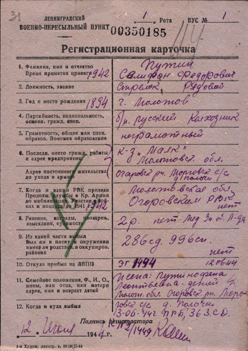 д.Поличи Очёрского района, призван 23 февраля 1942 г.Рядовой.1261 стр. полка 38 стр. дивизии. Погиб в бою.5 июля 1944 г.Похоронен на озере Вуокси в Ленинградской области.