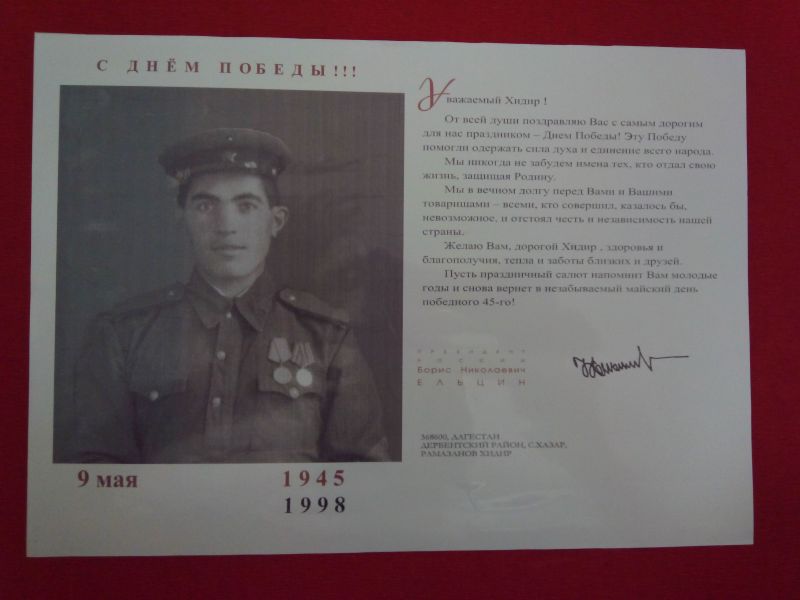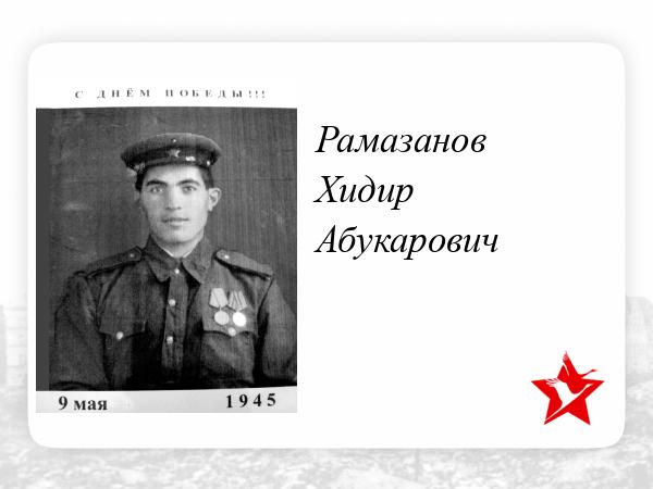 Мой дедушка - Рамазанов Хидир Абукарович родился в 1923 г. в с.Амака Курахского района Дагестанской АССР. На военную службу был призван 24 февраля 1942 г. Войну прошел в составе 234 зан. стрелкового полка (К сожелению большей информацией не владею, данные из военного билета). О войне дедушка не очень любил рассказывать. С его слов мне стало понятно, что война - это очень страшное дело, и победа ,которую люди добились ценой своих жизней, бесценна для нас! Жена дедушки, моя бабушка - Рамазанова Раижат в войну копала окопы для советских солдат. Хочется сказать, что эти два дорогих для меня человека являлись примером мужества, силы духа и бесконечной энергии. Как говорится - гвозди бы делать из этих людей, не было б крепче в Мире гвоздей! Жаль что их уже давно нет с нами... Вечная память и слава нашим дедушкам, бабушкам, отцам и мотерям, который дали нам возможность жить...
