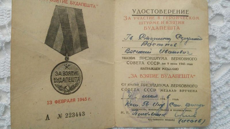Распопов Василий Иванович 1919 года рождения. Уроженец с. Петропавловка Ново- Покровского района Семипалатинской области Республика Казахстан. В 1939 году был призван на действительную военную службу в 131-й запасной стрелковый полк. С 1940 по 1942 гг. воевал в 4-м отдельном батальоне сапером. С 1942 по 1944гг. - 18 Гвардейский саперный батальон- сапер. С 1944 по 1945гг. - 56 Инженерно-саперная бригада - разведчик. С 1945 по 1946 гг.- 247 Инженерно-саперный батальон - сапер. В 1944 году получил ранение в ногу и был госпитализирован.Учавствовал во фронтах: