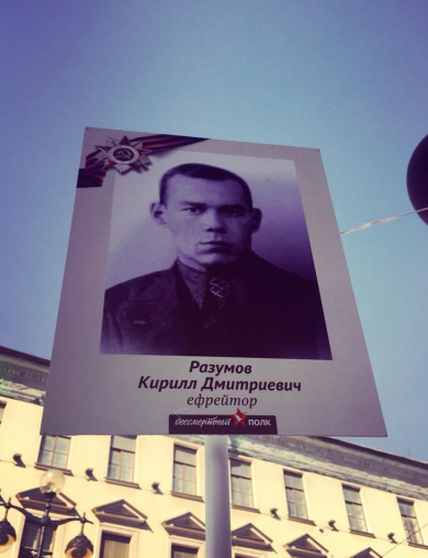 Мой прадедушка Разумов Кирилл Дмитриевич 1914 года рождения, рабочий, токарь, окончил 7 классов. Родился в Ленинграде, был призван 11.08.1941 Приморским РВК г. Ленинград. 19.08.1941 в составе 263 СП получил множественное осколочное ранение правого предплечья и правой кисти с повреждением II фаланги 2-го пальца; осколочное ранение мягких тканей теменной области. С 19.08.1941 ПМП 546-15 МСБ-ППГ 737. С 21.08.1941 ЭГ 2222. С 27.08.1941 ЭГ 3671 г. Ижевск УАССР. С 25.11.1941 выбыл из ЭГ 2222 в часть годным к нестроевой службе.