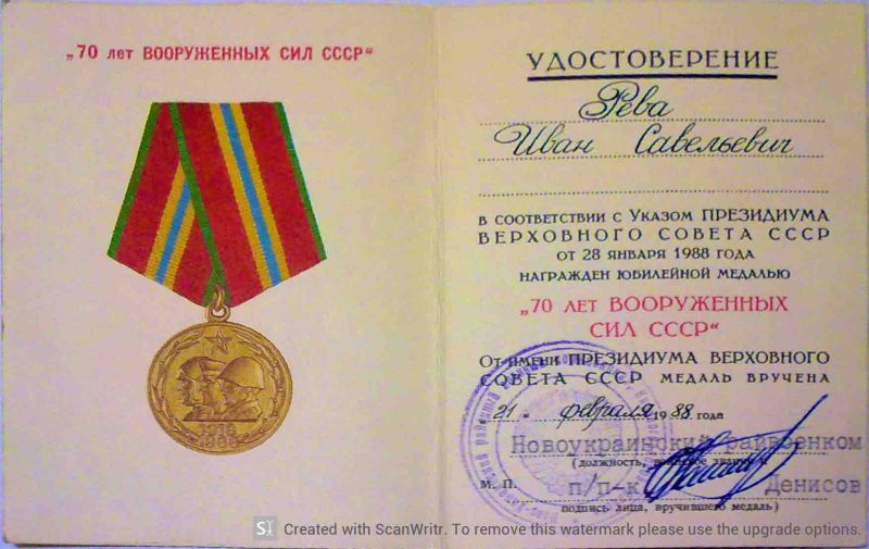Рева Иван Савельевич родился в 1921 году в селе Плетенный Ташлык Маловисковского района Кировоградской области УССР в семье крестьян-землепашцев.В 1929 году родители вступают в колхоз, впервые организованный. Семья состояла из десяти человек: 5 сыновей, 3 дочерей, отца и матери. В 1938 году поступил в Новоукраинский ветеринарный техникум, где проучился до сентября 1940 года и был призван в ряды Красной Армии и зачислен в 23 отдельную авиаэскадрилью, где прослужил до февраля 1942 года, в должности начальника прожекторной станции.С марта1942 по август 1942 года – 520 батальон аэродромного обслуживания, начальник прожекторной станции.С августа 1942 г. по ноябрь 1942 г. в 510 батальоне аэродромного обслуживания в должности начальника компрессорной станции.С ноября 1942 г. по март 1946 г. – 517 батальон аэродромного обслуживания в должности начальника компрессорной станции. C марта 1946 г. по май 1946 гг. – служил в 69 танковом полку шофером. 6 мая 1946 г. демобилизован на основании Указа Президиума Верховного Совета СССР от 20 марта 1946 г. Воевал в Великой Отечественной войне с ноября 1941 г. по май 1945 г.в составе 23 отдельной авиаэскадрильи 520 , 510, 517 батальон аэродромного обслуживания. В сентябре 1946 года снова поступи в ветеринарный техникум, окончил в 1948 году. 20 мая 1949 года был направлен Министерством сельского хозяйства на работу в Ровенскую область по специальности, где работал на должности заведующего ветеринарного участка в Подлипках. Имеет награды за участие в Великой Отечественной войне. Умер в 2002 году.