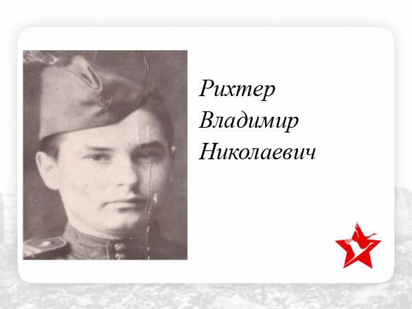 Рихтер Владимир Николаевич родился в 1925 году. В 1944 г. после окончания танкового училища попал на фронт в состав 922-го самоходного полка 65 армии 1-го Белорусского фронта. командовал которым генерал К.К. Рокосовский. Учавствовал в операции "Багратион", за которую был награжден орденом Красной Звезды. Освобождал Польшу и свой боевой путь закончил в Восточной Пруссии, где в феврале 1945 г. был тяжело ранен.