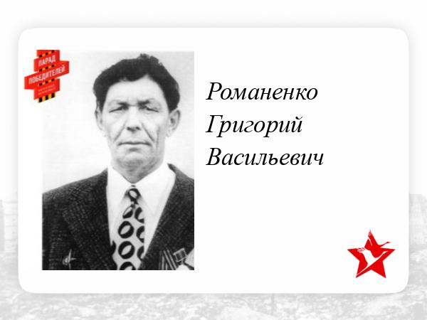 Родился 07.05.1923г. В 1938г - ученик токаря Тогузакский мехзавод. В феврале 1942 - ускоренный курс Калининского военно- химического училища в звании стар.лейтенанта направлен на I Прибалтийский фронт. Награжден: Орденом Красной звезды, Орденом славы II степени, медалями "за Победу над Германией в ВОВ 1941-1945гг" "20лет Победы в ВОВ 1941-1945гг.Умер.28.07.94.