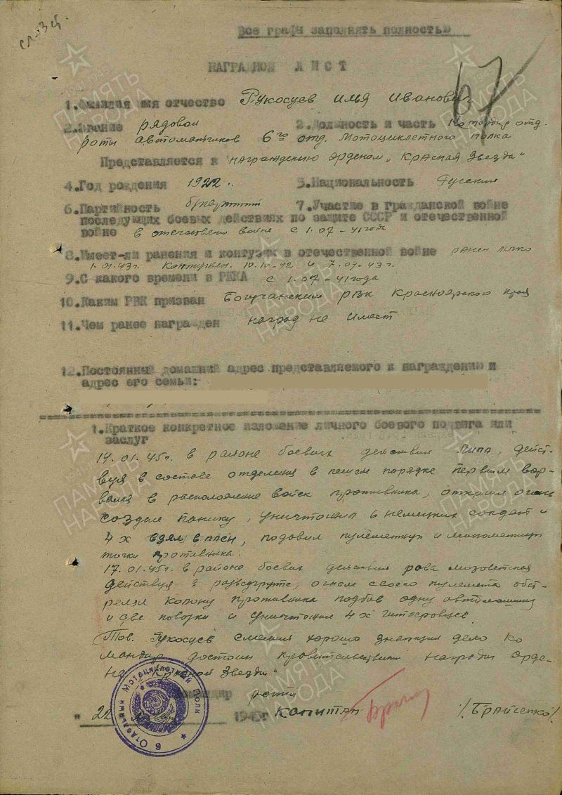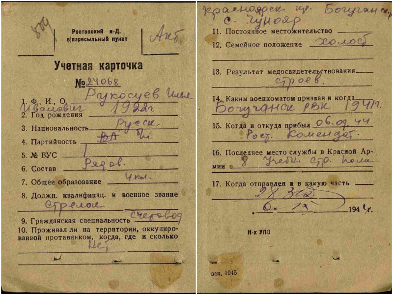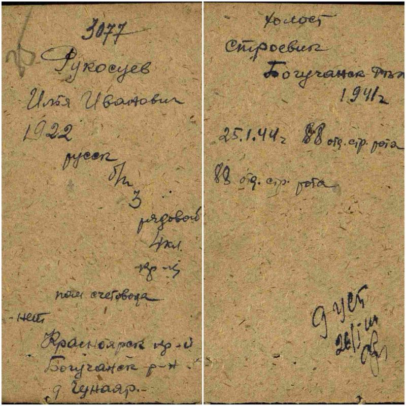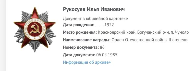 Рукосуев Илья Иванович, 1922 г. р. Место рождения Красноярский край, Богучанский район, д. Чунояр. Призван Богучанским РВК в 1941 году. Красноармеец. Командир отделения. В/ч 226 оср АС БО ТОФ. В 1942 году передислоцирован на западный фронт. В/ч 6 омцп 1 ТА. Участник Сталинградской битвы. Участник штурма Берлина. Дважды ранен. Награждён медалью За отвагу, медалью За Победу над Германией в Великой Отечественной войне 1941-1945 гг., юбилейным орденом Отечественной войны 2 степени. Отец Рукосуев Иван Савельевич.