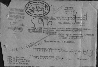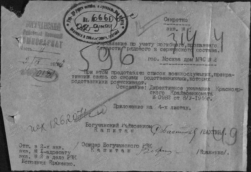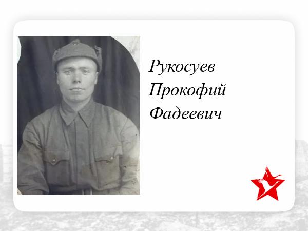 Рукосуев Прокофий Фадеевич, 1915г.р Место рождения Красноярский край, Богучанский район, д.Ирба. Призван Богучанским РВК в 1941году. Красноармеец. Стрелок. Письменная связь прекратилась в 1941 году.Пропал без вести в январе 1942 года.В документе написано имя Профний, возможно ошибка). Отец Рукосуев Фадей Иванович.
