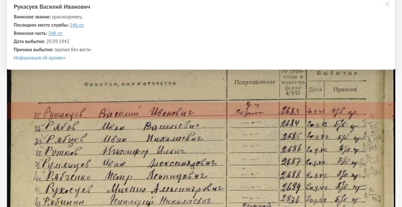 Рукосуев Василий Иванович, 1908 (1910) г. р. Место рождения Красноярский край, Богучанский район, д. Пинчуга. Призван Богучанским РВК в 1941 году. Красноармеец. Стрелок. В/ч 546 сп 191 сд. Пропал без вести в боях с 5.09. по 20.09.1942 года. Ленинградская область, Мгинский район, д. Синявино, в районе.