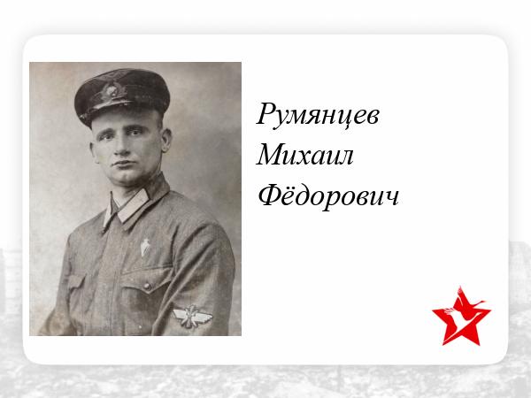 Румянцев Михаил Фёдорович родился в г. Кинешма, Ивановской обл, в 1918 году. Вся семья проживала по адресу: Ивановская обл,г. Кинешма,п/о Пестовка,ул. Овражная, д.22. Отец Михаила - Румянцев Фёдор Степанович ( 1886г. - 30.04.1955г) работал на Кинешемском ипподроме , объезчиком лошадей и занимал, до войны, первые места на соревнованиях по конным скачкам. Мать - Румянцева Наталья Павловна ( дев. Соловьёва) ( 1890г- 19.01.1968г) была домохозяйкой. У Михаила были две сестры: Александра ( 1914 г.р.) и Екатерина (1920 г.р.).Румянцев Михаил Фёдорович закончил среднюю школу № 1, в г. Кинешма, Ивановской области.После окончания школы, в 1935 г, устроился работать на радиоузел им. Демьяна Бедного, в г. Кинешма.В свободное от работы время , до 1938 года,занимался в Кинешемском аэроклубе им. Леваневского. В 1938 году, Румянцев Михаил Фёдорович был направлен для прохождения обучения,в качестве курсанта ,во 2-ю авиационную школу Гражданского Воздушного флота СССР им. Петрова,в г. Тамбов.
