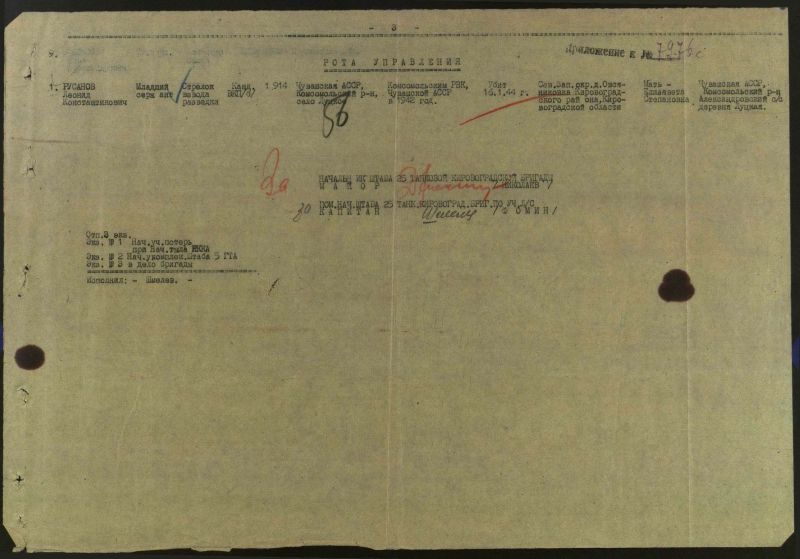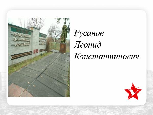 Родной брат моего прадеда, Русанов Леонид Константинович, родился в 1914 году в с.Луцкое Комсомольского района Чувашской республики в семье священника, призван в Красную армию в январе 1942 года Комсомольским РВК. Стрелок взвода разведки. Со слов сослуживцев известно, что возвращаясь с разведки был ранен, получил обморожения и скончался в госпитале 16 января 1944г. Похоронен в с.Овсяниковка Кировоградского района Кировоградской области Украина. Фотографий не сохранилось.