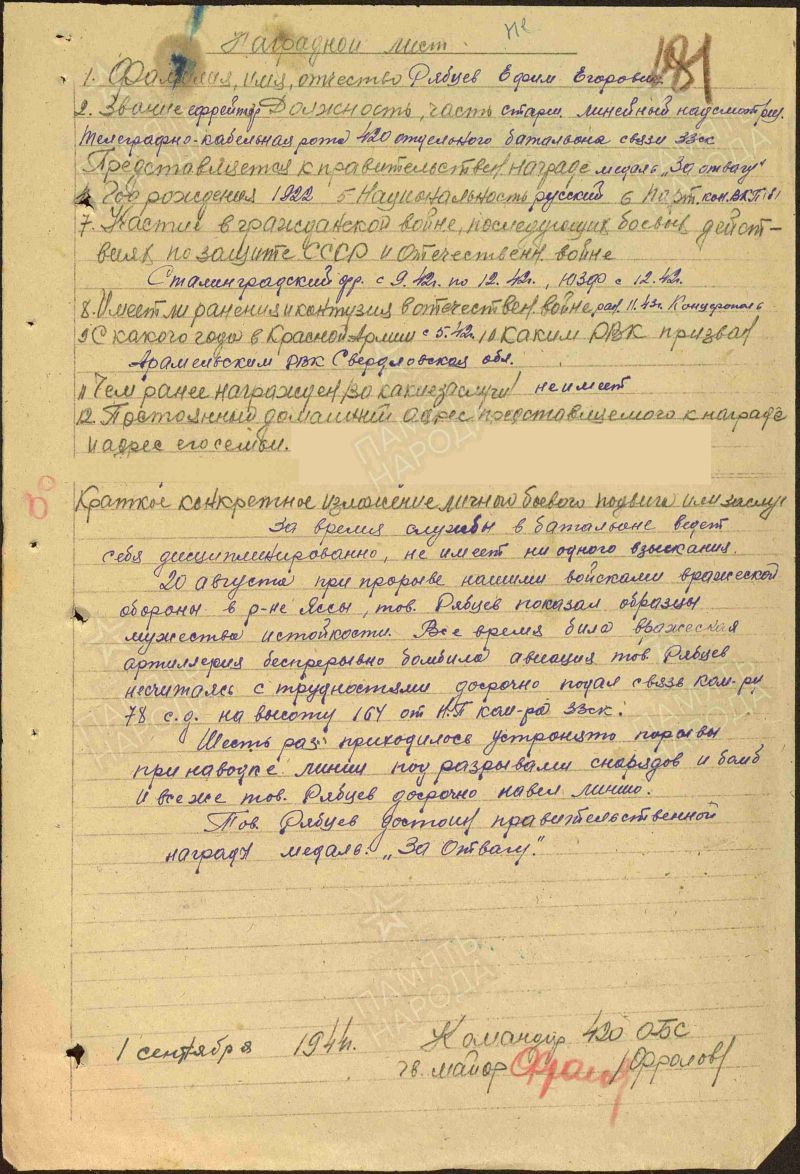Из наградного листа от 1 сентября 1944 года: «...за время службы в батальоне ведёт себя дисциплинированно, не имеет ни одного взыскания. 20 августа при прорыве нашими войсками вражеской обороны в районе Яссы (Румыния), тов. Рябцев показал образцы мужества и стойкости. Всё время била вражеская артиллерия, беспрерывно бомбила авиация. Тов. Рябцев, не считаясь с трудностями, досрочно подал связь командиру 78 с.д. на высоту 164. Шесть раз приходилось устранять порывы при наводке линии под разрывами снарядов и бомб. И всё же тов. Рябцев досрочно навёл линию. Тов. Рябцев достоин правительственной награды — медаль «За отвагу».