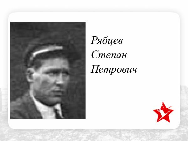 Мой дедушка, Рябцев Степан Петрович, 1910 года рождения, в 1941 году ушел на фронт вместе со своими родными братьями Иваном и Игнатом. С декабря 1943 года числится пропавшим без вести. Уходя в 41-м году защищать Родину, оставил жену Анастасию (мою бабушку) с тремя детьми: двумя сыновьями Сашей и Толей (мой папа) и дочерью Зоей. Очень мало информации о нём, к сожалению... Имя деда внесено в "Книгу Памяти Республики Башкортостан". Наша семья помнит своего героя и гордится им.