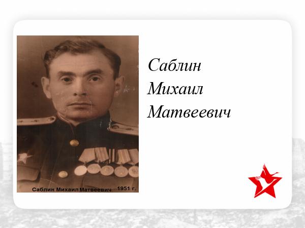 Военная история моего отца,Саблина Михаила Матвеевича,началась в 1939 г.,когда его призвали в армию и направили в военно-мед, училище г. Харькова.В 1941 Москва,краткие врачебные курсы и оборона Москвы,бои-спасение раненых.Затем Западный,Прибалтийский фронты,война с Японией.Весь этот тяжёлый военный путь он прошёл фельдшером дивизиона,29 гвардейской тяжёлой гаубичной артбригады прорыва. После окончания войны служил в сов.армии в Китае,на Дальнем Востоке. В 1958г выйдя в запас,вернулся на родину,где долгие годы работал в районной поликлинике хирургом.