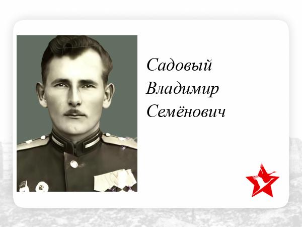 В представлении к награде отмечается: «За время пребывания в дивизионе т. Садовый показал себя как умелый, знающий своё дело, бесстрашный водитель. В последних боях за города Шейбе и Вайтгафен 8 и 9 мая, благодаря умелому вождению самоходки тов. Садовым, её экипаж уничтожил 3 автомашины противника и, кроме того, захватил обоз из 8 повозок с 13 немецкими солдатами.