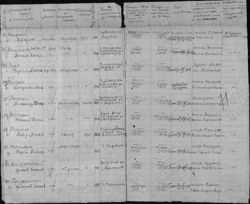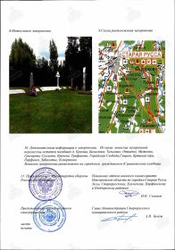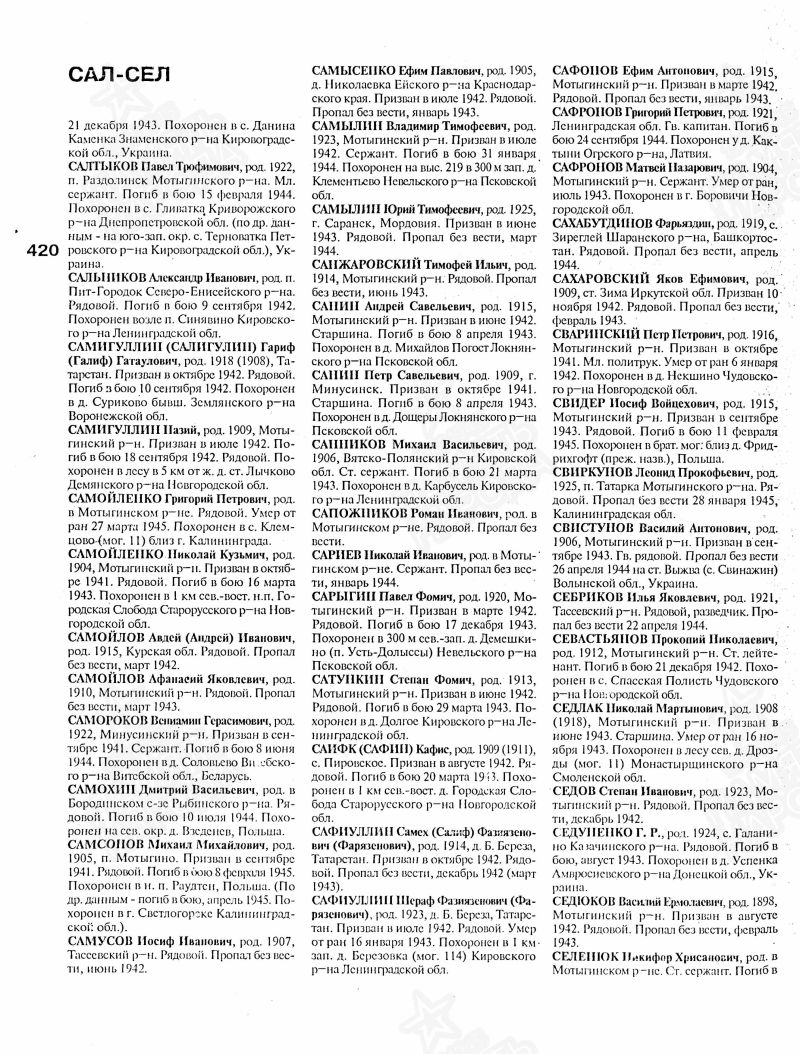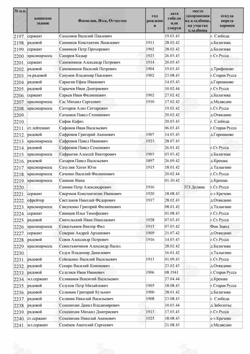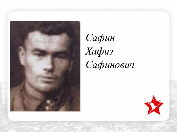 Сафин Хафиз Сафинович, 1911 (1909) г. р. Место рождения Красноярский край, Пировский район, с. Пировское. До войны жил в Красноярском крае, Удерейский район, прииск Новая Еруда. Призван Удерейским РВК в 1942 году. Красноармеец. Стрелок. В/ч 877 сп 282 сд. Последнее письмо родные получили в марте 1943 года. Признан пропавшим без вести в мае 1943 года. Убит в бою 20.03.1943 года. Похоронен Ленинградская область, Старорусский район, д. Городская Слобода, северо-восточнее 1 км. Перезахоронен Новгородская область, Старорусский район, г. Старая Русса. В документах допущены ошибки Сафик Кафиз.