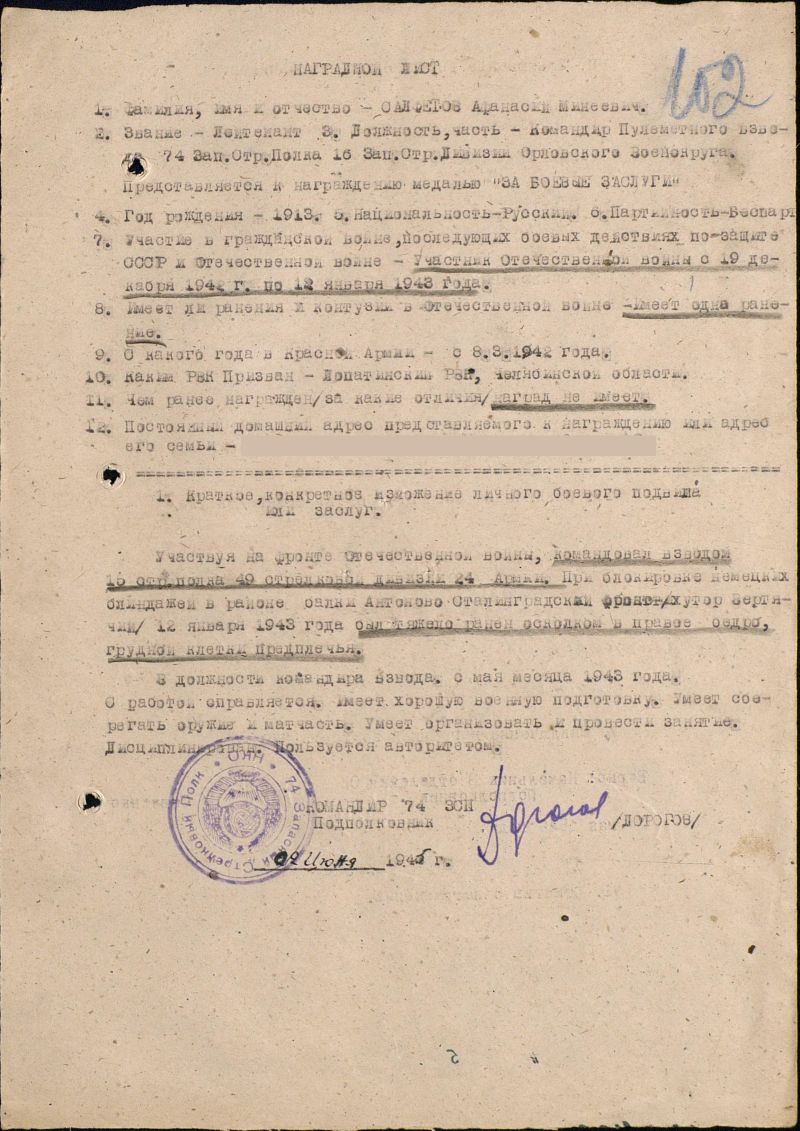 В Архиве я наша описание подвига дедушки и наградной лист. Он награжден медалью «За боевые заслуги».