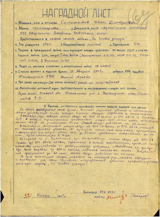 Участник ВОВ: февраль - май 1943 Воронежский фронт, май - июль 1943 Юго-Западный фронт, июль - октябрь 1943 Степной фронт, октябрь 1943 2-й Украинский фронт)