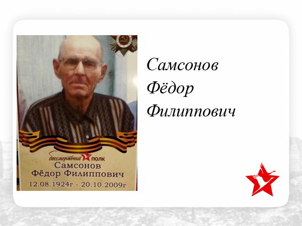 Самсонов Федор Филиппович родился 12 августа 1924 года в деревне Няшино Армизонского района Тюменской области .Когда началась Великая Отечественная война ему было 18 лет и с 22 августа 1942 году он пошел на фронт.Служил в 176 строевом полку войск НКВД .С ноября 1942 года ефрейтор в 56 пограничном отряде ,входящим в состав Дальневостоного фронта,участвовал в войне с японцами ,был награжден медалями: "За Победу над Германией" ,"За Победу над Японией " ,"Орден Отечественной войны 2 степени".С войны вернулся 28 декабря 1948 года в деревню Няшино с небольшими ранениями на теле .В дальнейшем был награжден медалью " 30 лет Советской Армии и флота" ,а также юбилейными медалями .Женился,воспитывал 5 детей .На протяжении своей жизни работал председателем сельского совета ,лесником .Любил природу ,особенно лес ,его руками было посажено много елей и сосен.В августе 2009 года он умер .Мы считаем своего отца и дедушку ,прадедушку настоящим героем и будем помнить, и гордиться им всегда.