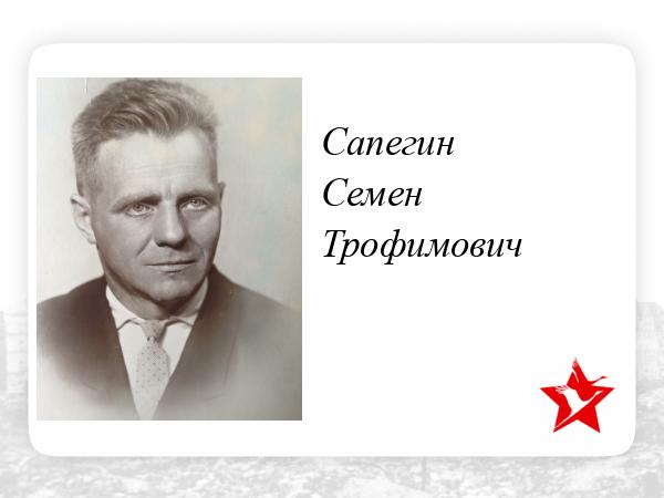 До начала войны мой дед Сапегин Семен Трофимович жил в Деревне Савино Псковской обл., родители умерли рано, его воспитывала тетя Варвара, в годы войны она в своём доме спрятала от немцев двух наших летчиков в деревне Церковище, родной брат Пётр Трофимович Сапегин в годы войны был сыном полка, было ему тогда 14 лет.