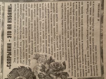 Про взятие Берлина дедушка говорил "Какова была радость! Этот день запомнился всем как день великого торжества. Многие поставили свои подписи на здании рейстага. Расписался и я : "Сапрыкин - это на Кубани..."