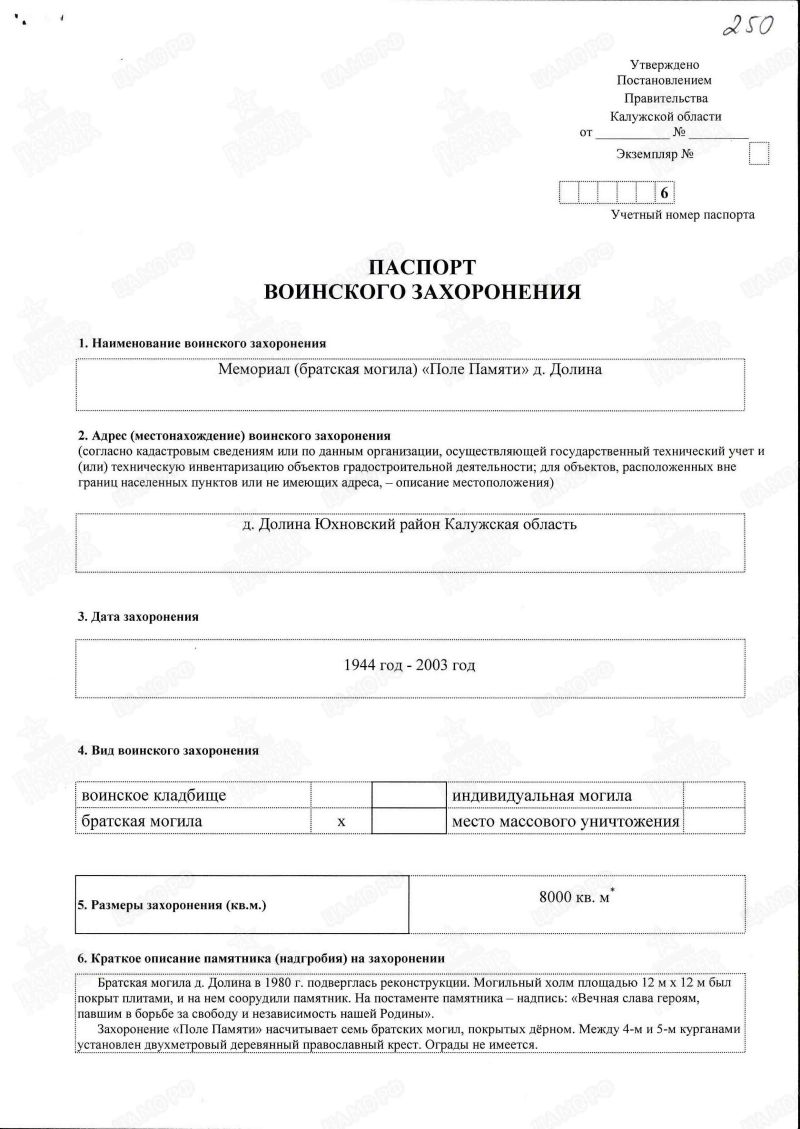- захоронения: РОССИЯ: Калужская область, Юхновский район, деревня Долина, Воинский мемориал (рядом с 214 км Варшавского шоссе), Поле Памяти ("Провинциальный фельетон Фома МЕТЁЛКИН", Юхновский район. Долина: https://fomametelkin.ru/articles/13559 ); 10;