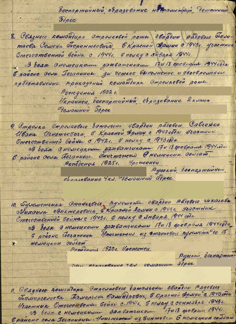 В результате боев, 17-18 февраля 1944 г. В районе села Почапинцы Винницкой области, был награжден медалью "За Отвагу".