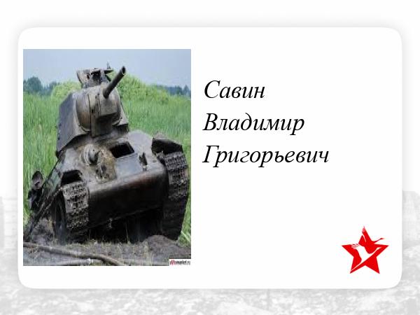 Савин Владимир Григорьевич, родился в июле 1926 года. В Красную Армию призван Курганским РВК, города Курган в октябре 1943 года. На полях Великой Отечественной войны с ноября 1944 года. В декабре 1944 года воевал в качестве командира орудия, в экипаже командира танкового взвода Т-34, 1-го танкового батальона, 22-й гвардейской танковой ордена Богдана Хмельницкого бригады, 5-го гвардейского танкового Сталинградско-Киевского ордена Суворова корпуса, 6-й гвардейской танковой армии, 2-го Украинского фронта, в звании гвардии сержант.