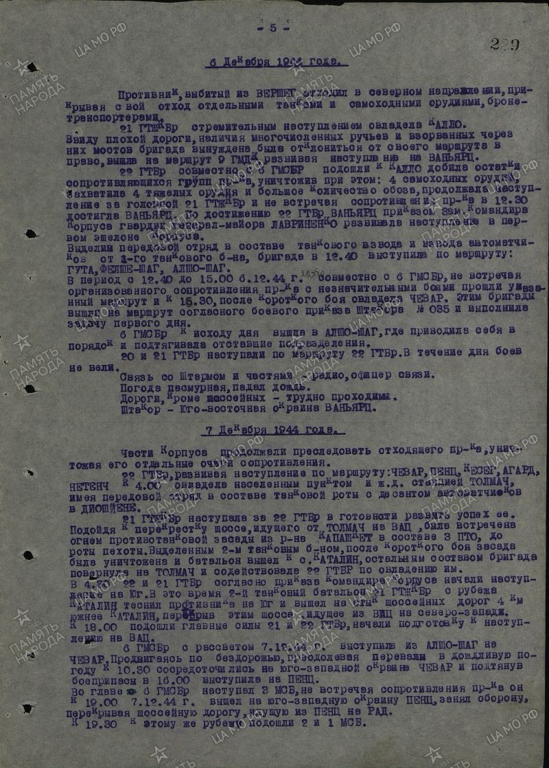 7 декабря 1944 года. Части корпуса продолжали преследование отходящего противника… 22 ГТБр, развивая наступление по маршруту: Чевар, Пенц, Кесег, Агард, Нетенч, к 4.00 овладела населенным пунктом и ж.д. станцией Толмач (венг. Tolmács, в 21 км северо-западнее Чевар)… Корпус в результате боев за Чевар, Пенц, Кесег, Толмач, шоссе севернее Вац, разгромил многочисленные обозы и автоколонну противника… Корпус потерял: танков сожженных – 10, подбитых – 8; убито – 19 человек, ранено – 39…