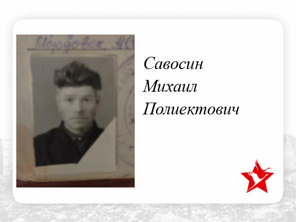 Мой дед Савосин Михаил Полиектович,служил стрелком в Гвардейском минометном полку 6 Гвардейской минометной дивизии.Участвовал в боях на Великой Отечественной войне с 30 мая по 15 августа 1944 года. Был ранен, находился в госпитале г.Могилев с августа по октябрь 1944 года.