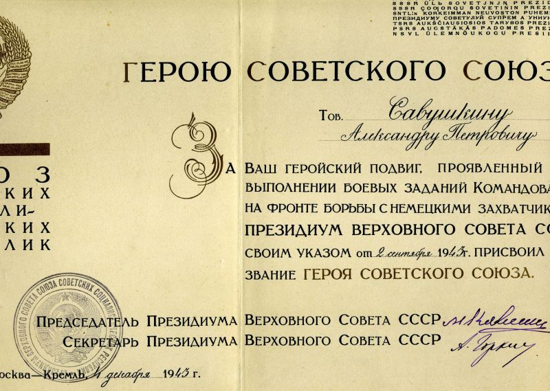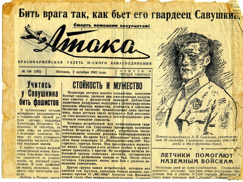 Мой дед,Савушкин Александр Петрович,прошёл путь от простого крестьянского парня до аса-истребителя. Закончив аэроклуб,стал кадровым военным. Боевые награды получил ещё в советско-финскую войну. С первого дня в боях на Ленинградском фронте.Лично сбил с начала войны 18 немецких самолётов,имел тяжелое ранение,контузию,погиб из-за технической ошибки при подготовке самолёта 17 мая 1943. Похоронен в парке Сосновка,на месте дислокации аэродрома. Посмертно представлен к званию Героя СССР,его имя присвоено улице в СПб. Я был назван в его честь...
