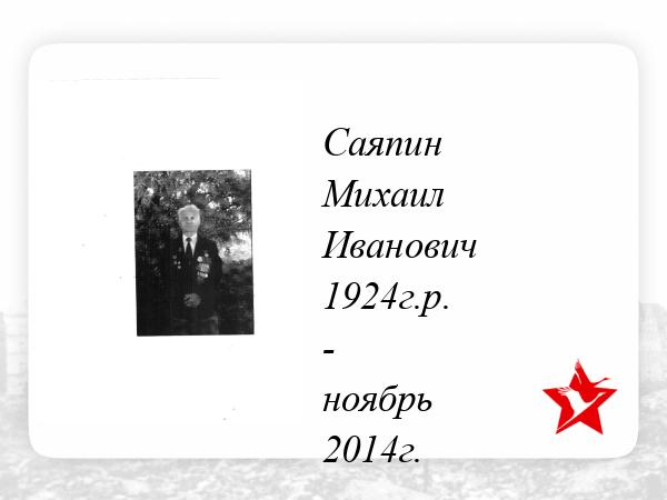 Саяпин Михаил Иванович 1924 г.р. Родился в Тамбовской обл., с. Павлодар. Дошел до Берлина.