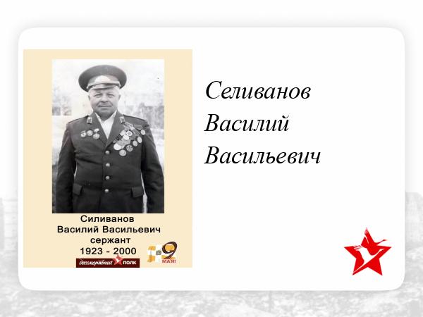 Селиванов Василий Васильевич. Годы жизни: 20апреля 1923г. С 15 сентября 1942г.-9 мая 1945. Звание: сержант. Призыв: Уральский военкомат с 15 мая 1942г. Награды: медаль за оборону Сталинграда , за отвагу, за победу над Германией, Орден 1 Степени Отечественной войны.